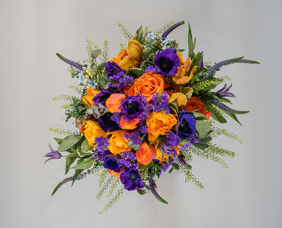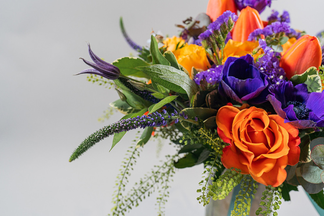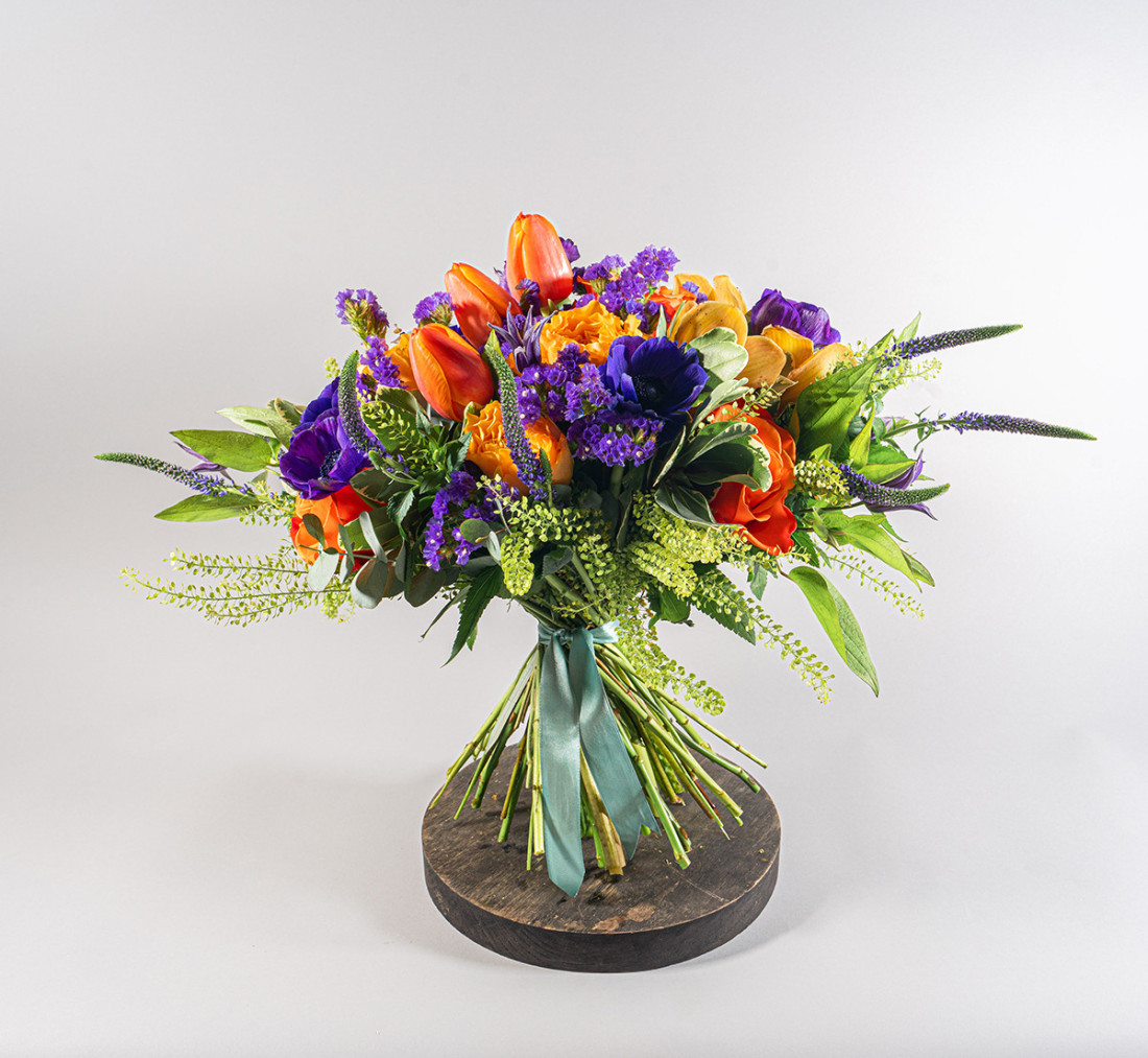 Arreglo floral en tonos anaranjados y azules con el que sorprenderá a la persona elegida debido a su colorido y variedad de flores.